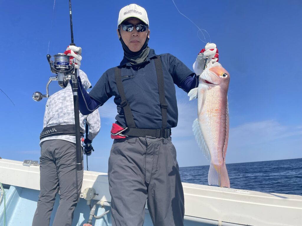今日は乗船時雨が降ってましたが、沖に出てみると雨もあがってくれて、助かりました。1日潮も流れて風も西風で良さそうな雰囲気でした。相変わらずアカビラは元気に遊んでくれて助かります。中学三年生のオフショアジギング、デビューの子もアカビラゲット出来ました。これから一端のジギンガーに育って欲しいものです。(笑)